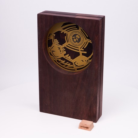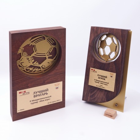 Приз представляет из себя деревянную конструкцию, оснащенную металлическими вставками мяча и таблички.
